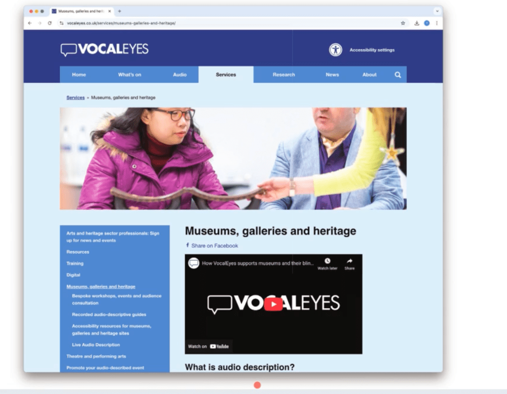 VocalEyes is a UK-based organization that provides audio description services for people who are blind or have low vision.
