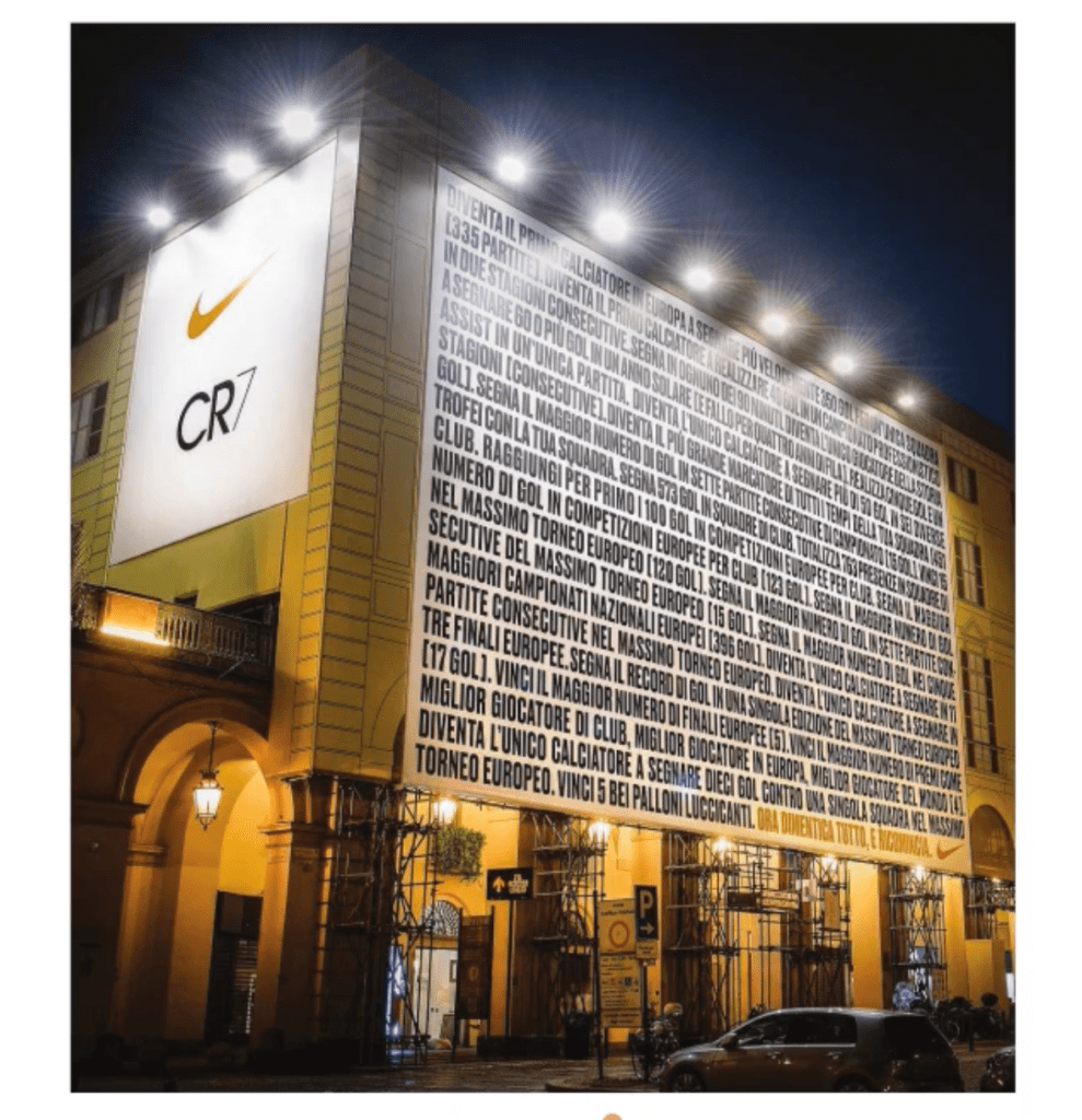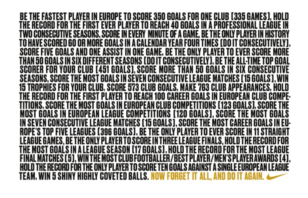 The image is a Nike advertisement that lists a series of impressive accomplishments by a single football player, widely associated with Cristiano Ronaldo, and concludes with the phrase, “NOW FORGET IT ALL, AND DO IT AGAIN”.