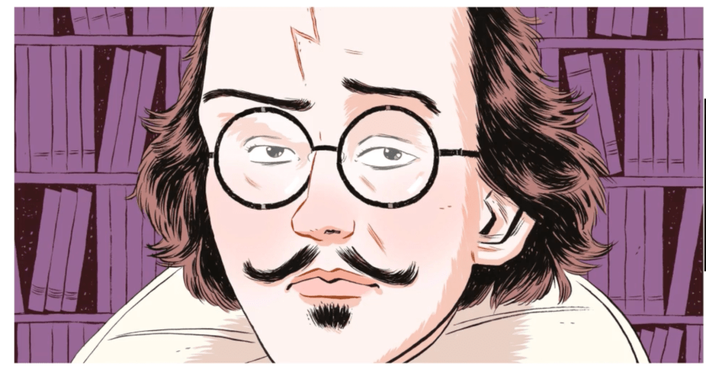 The image is an illustration of a character that combines the likeness of William Shakespeare with the lightning-bolt scar of Harry Potter. This type of creative work is known as fan fiction, which is a genre of writing where fans create new stories using existing characters or settings from a work of fiction.