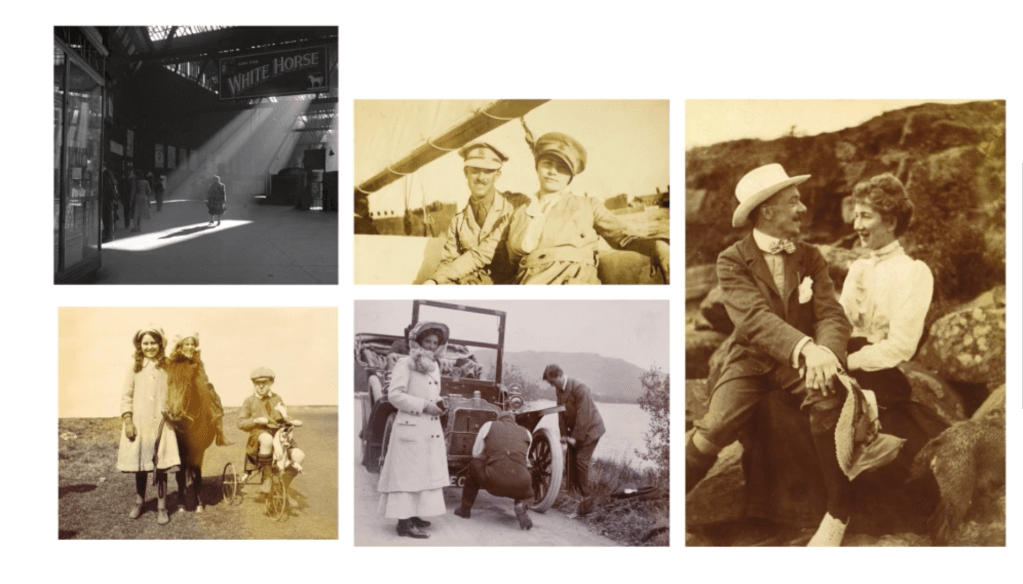 - Top Right: A man in a hat sits on a rock next to a smiling woman, both dressed in early 20th-century fashion.