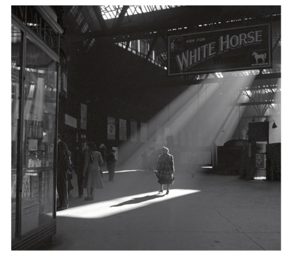 - Top Left: A person walks through a sunlit indoor space with a sign that reads “WHITE HORSE” above them.